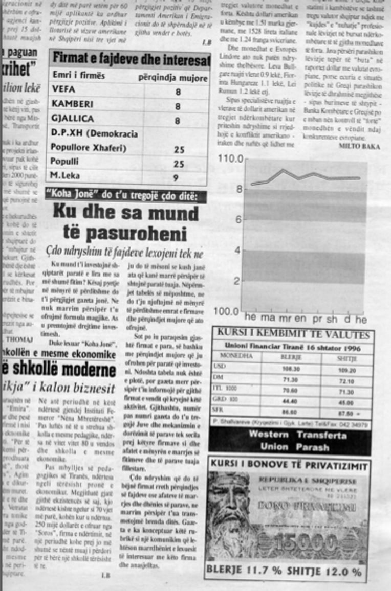 The newspaper announces that, alongside the daily monetary exchange rate and the exchange rate of letra me vlere (privatization bonds), it will now regularly display the interest rates of the different kompani and fondacione. Koha Jone describes them as firma te fajdeve (money-lending firms), after their collapse these were all considered as pyramid schemes. The headline of the accouncement (typed in bold) says "Koha Jone will tell you everyday: Where and How Much to Get Richer".