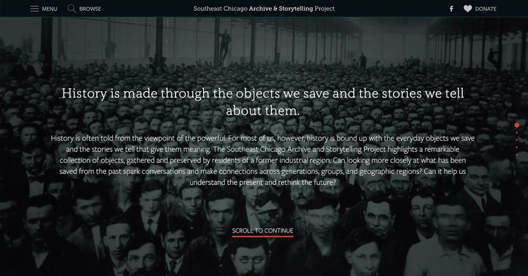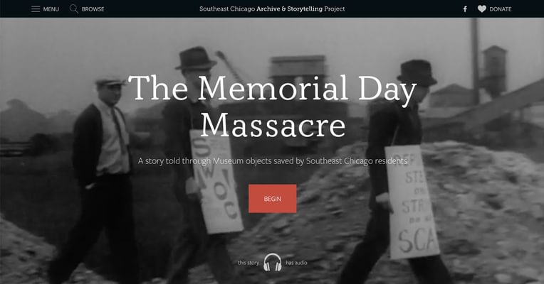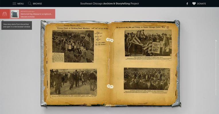 Soyk writes: I have always been fascinated by the objects we choose to save, and the Southeast Chicago Historical Museum is clearly not in short supply. It is packed with profound and intimate objects that offer a unique perspective into life in that region. Yet, as a visitor, forming connections between objects can be challenging, especially given the quantity and breadth of the resident-donated materials. This is where the “Storylines” section of the SECASP website comes in. “Storylines” are immersive stories told in the form of an “interactive documentary”—essentially a documentary that is created using the interactive web medium. They weave museum objects together to tease out their meaning and to build a narrative for website visitors to explore. Each storyline merges photographs, videos, oral histories, historical text, and soundscapes, to create a story experience built on the memories and emotions so vividly expressed in the archive materials. Upon entry into a storyline, visitors are introduced to a single object of interest that is related to a contemporary resident. In the Memorial Day Massacre storyline, for example, we are introduced to Mike Borozan in the present day as he holds a 1930s scrapbook in his hand. Mike is the son of the creator of that scrapbook. This has allowed the “Storylines” team to address the relationship between past and present and to involve local residents in the storytelling process. We also expect these storylines to engage current and future students in a classroom setting, not only to provide insight into the region’s history, but to open up larger conversations around the themes and topics addressed. The Southeast Chicago Archive and Storytelling Project has provided an incredible opportunity to get these materials out onto a bigger stage and to consider what we can learn from their examination and preservation.