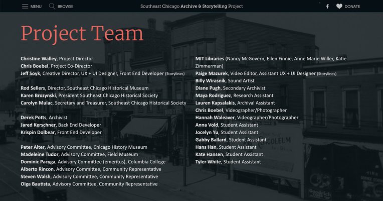 The Southeast Chicago Archive and Storytelling Project (SECASP) is an online collaborative venture ten years in the making. It highlights materials donated to the all-volunteer Southeast Chicago Historical Museum by the diverse working-class residents who settled in this former steel mill region. This multimodal project uses residents’ saved objects—and the stories they told about them—to bring to life everyday experiences of work, immigration, job loss, and environmental contamination from their own points of view. It understands storytelling around objects to be key to cross-generational conversation both within working-class communities and beyond, laying the groundwork to help residents (and others) imagine futures that both build upon and transcend this simultaneously rich yet troubled past. The project began after anthropologist and former Southeast Chicago resident Chris Walley and filmmaker Chris Boebel proposed a collaboration to museum volunteers and Director Rod Sellers. The website sechicagohistory.org includes four innovative mini-documentaries or “storylines” in addition to an online archive. The site has been created by a project team, including creative director Jeff Soyk, in collaboration with Museum volunteers and community residents, and it is overseen by an advisory committee.