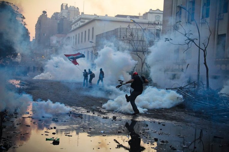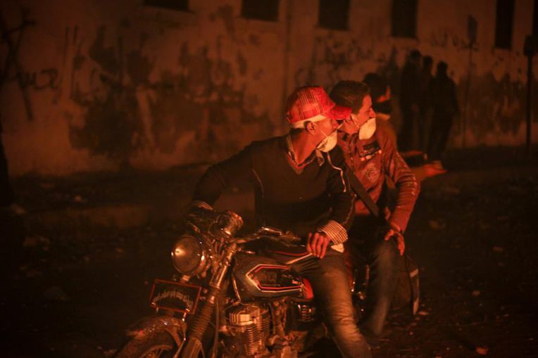 Groups of young men on the front line were exposed to swathes of tear gas. Motorcycles carried the wounded and those exposed to the gas back to safety. Behind the front line, there were crowds of supporters and onlookers, escaping from the rain of tear gas and shotgun shells, and moving back and forth closer and further from the Ministry of Interior.