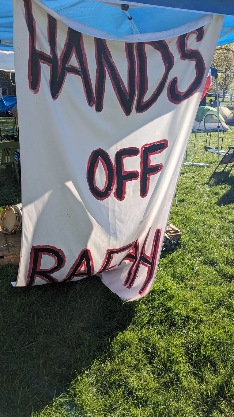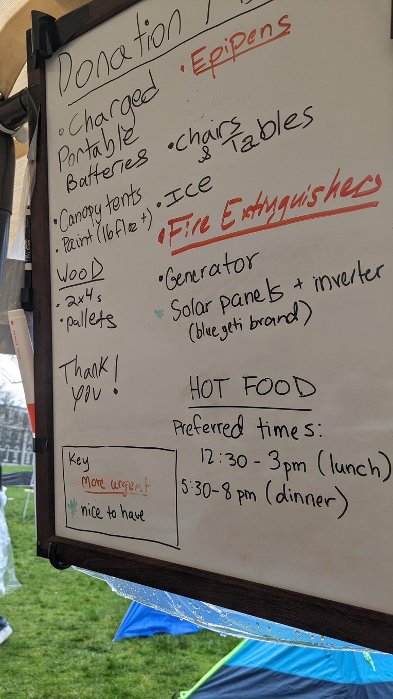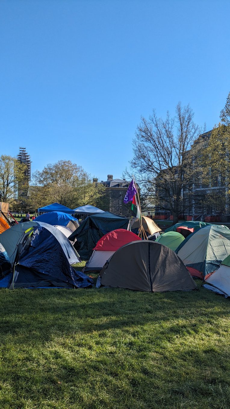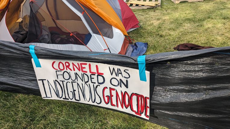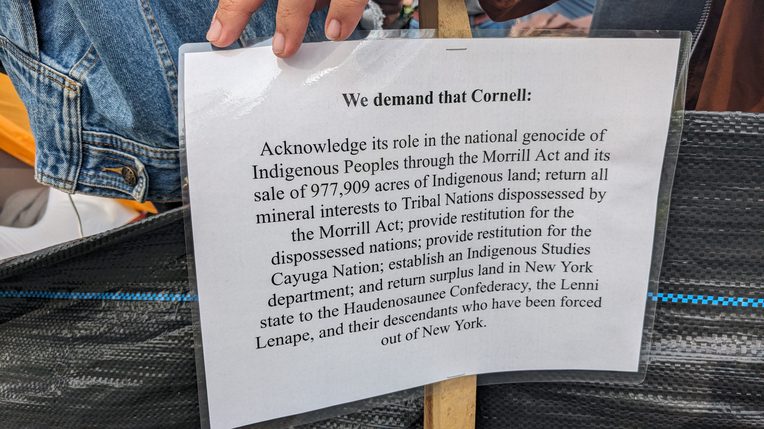 The Liberated Zone demands are an important public record because they showcase what the encampment stood for. These demands stand out because of their emphasis on mutual liberation and Cornell-specific histories of profit from genocide. Students demand restitution for Cornell’s foundational exploitation of and profit from Indigenous dispossession and genocide as well as divestment from military companies involved in Israel’s genocide on Palestinians and other war crimes around the world.