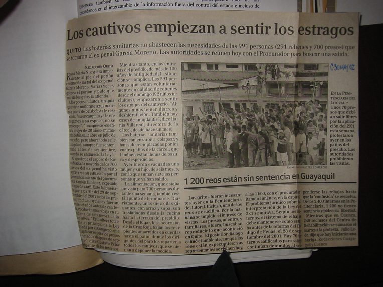 No. 4 "Earlier in 2003, prisoners [living] in this state of exceptional incarceration responded to their abject legal condition with the announcement of imminent revolts.... Well aware of their [prisoner] compatriots’ [failed mutinies], Guayaquil’s preventively incarcerated now sought “more peaceable” measures to wrest what they considered their inalienable rights from an unwilling state."