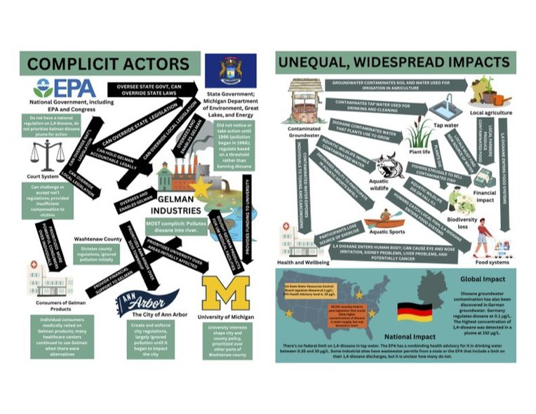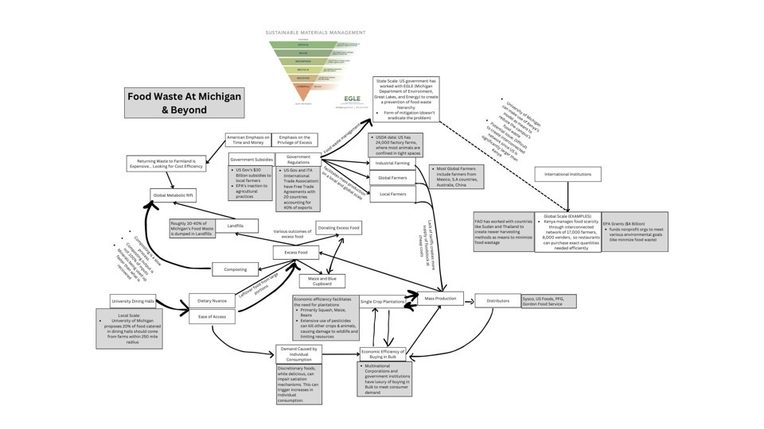 To accomplish this, we asked the class to conduct independent research and produce a visualization in the form of a flowchart via Miro, a storymap via ArcGIS, or an old-fashioned illustration. We explained that their goal should be to chart specific institutions, actors, and ordinances that linked their problem in Ann Arbor to other local, regional, national, and global contexts. For example, a group researching road salt in Michigan found that salt-mining in Alagoas, Brazil, contributed to ground sinking and extreme poverty. Another group researching DTE Energy found that coal and natural gas were sourced in part from the Powder River Basin in Montana and Utah, where toxic contaminants have been linked to higher rates of cancer and pre-birth defects. Images of our students’ exemplary scale charts on food waste and 1, 4 Dioxane pollution are below, as well as in this Miro flowchart on invasive grasses[1] and another on construction.[2]