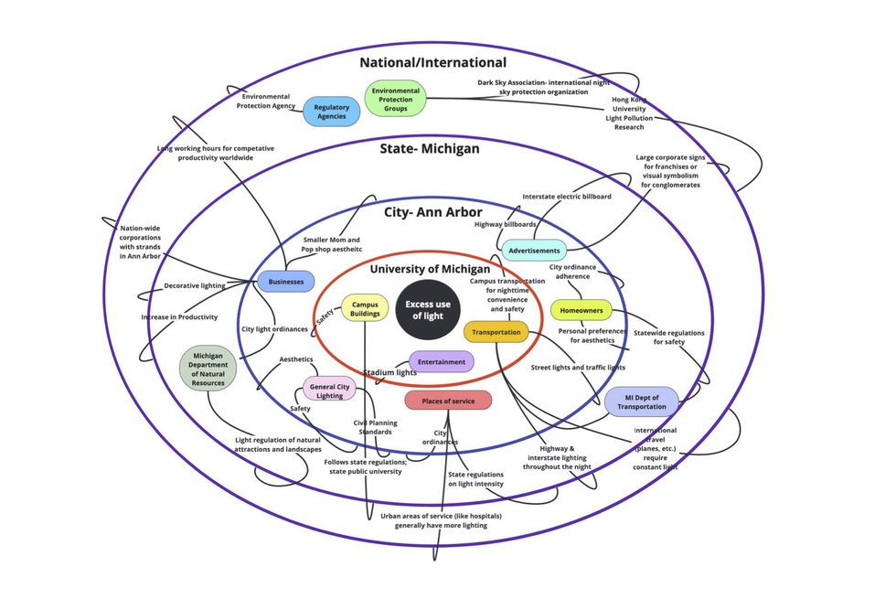 Our students used the assignment to learn about an impressive array of “meaningful responses” from around the world. Initiatives like the Harvard Construction Mitigation Program and the Hong Kong University Light Pollution Collective include ordinary citizens in defining problems and articulating solutions. The Asia-Pacific Forest Invasive Species Network addresses the multi-scalar problem through inter-country cooperation. Several groups identified publicly accessible resources: complementary “Salt Watch” kits from the Izaak Walton League; food and pantry items from The Maize & Blue Cupboard; and free native seeds from the UM Seed Library. Other campaigns, like Ann Arbor for Public Power, invite citizens to imagine alternative energy infrastructures.