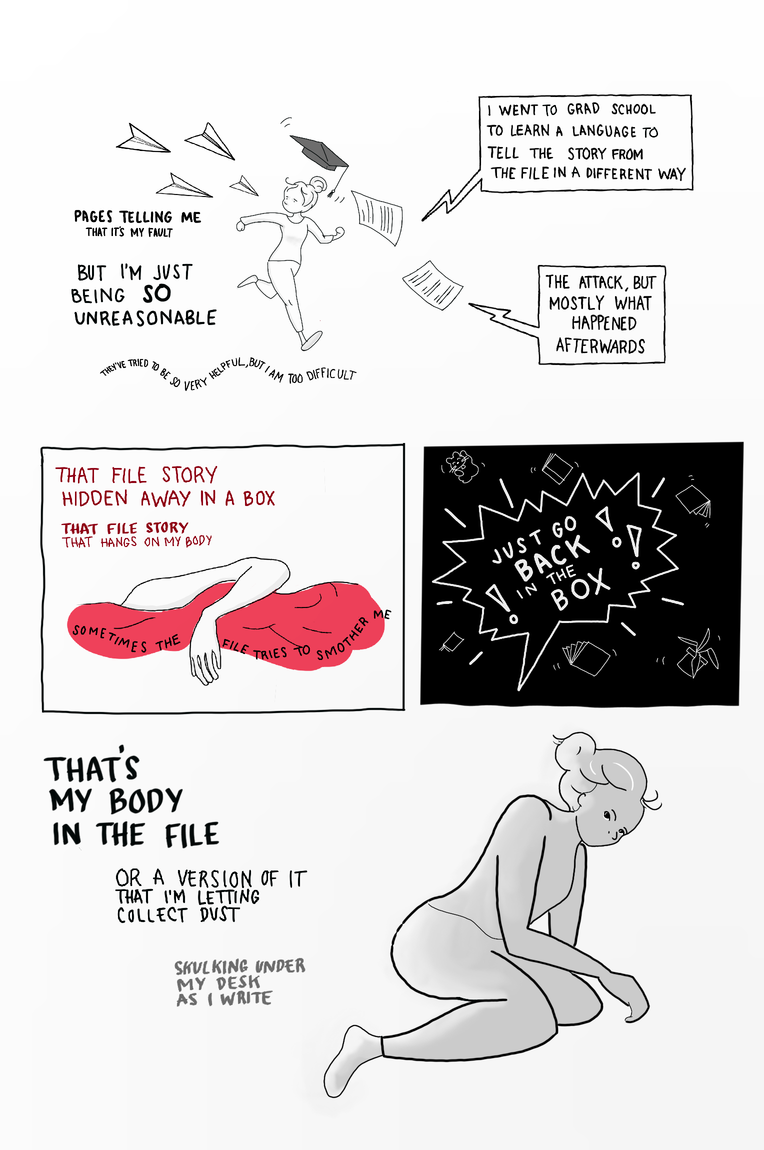 When certain forms of text and interview constitute captivity, the visual can offer fracture lines; unexpected openings and departures. Multimodal presentation can recalibrate the frequency and scale of a story and the work it does, creaking open obscured windows to reveal different kinds of possibilities. Here, around a story about sexual assault and the archive, multimodality offers a crack—the box, the file, the papers slip open—revealing, perhaps, new modes of conversing and sitting with assault, its uninvited and invited returns and its afterlife. As Lisa Stevenson (2014, 10) writes, the “imagistic rather than discursive modes of knowing” is a kind of uncertain hatch—if we open it, it requires us to listen and engage differently.