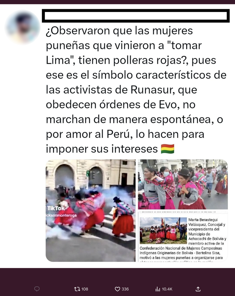 In early March police in Lima shot tear gas cannisters at the bodies of protesting Aymara women from Puno. One tweeter claimed that the fact that the women wore red skirts was evidence that they were activists of “Runasur, who obey the orders of Evo [Morales], they do not march spontaneously, because they love Peru, they do it to impose their interests” (Figure 2). This claim taps into a long tradition of accusing those who dare to protest against the status quo of being foreigners, of doing the bidding of a foreign power, or of hating Peru. It also reveals how the internal enemy is often gendered in ways that reinforce its association with Indigeneity.