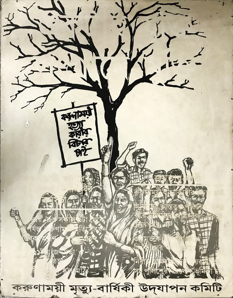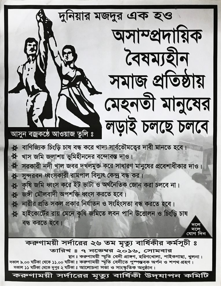 This is evident in the posters produced by Nijera Kori in celebration of ‘Karunamoyee Day’ each year. The poster from 1993, for example, seeks justice for Karunamoyee’s murder and a call to end police harassment of villagers. The poster from 1996, alongside the issue of shrimp cultivation, also demands reforms of the education system, equitable distribution of government-owned land, and a demand for wage equality between men and women. Similarly, diverse issues such as an eradication of communal violence, the trial of 1971 war criminals, the enactment of a common family law for all religions, and a complete stop of the construction of the nearby Rampal Coal Power Plant, are articulated in posters from 1999, 2004, 2014, and 2016.