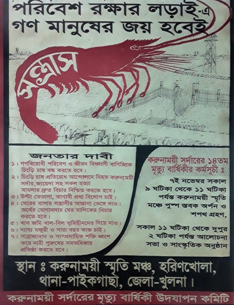 Every year on November 7, thousands of men and women gather at Harinkhola village in Polder 22 of Paikgacha, Khulna, in southwestern Bangladesh, to commemorate the death of Karunamoyee Sarder and the mass movement it sparked. Karunamoyee, a landless widow, was murdered on that day in 1990 while leading a demonstration of villagers protesting against a local shrimp farm owner with political ties. The owner, with the help of armed goons, had tried to take over the polder to start shrimp farming. His men had fired at the procession, killing Karunamoyee and injuring many.
