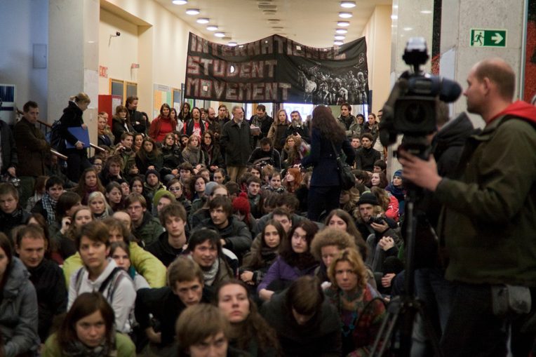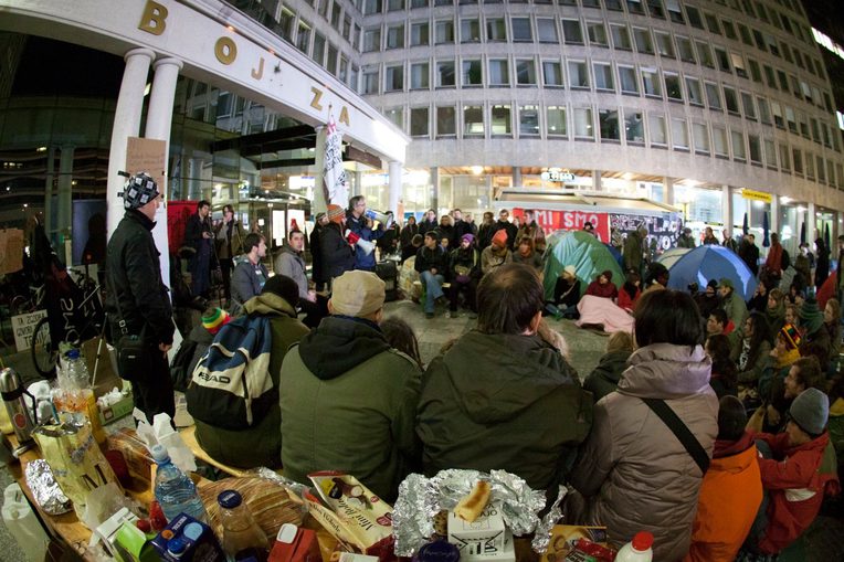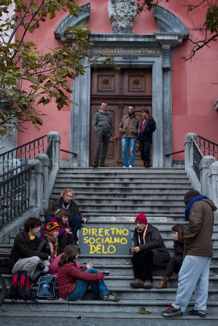 Sara offered this account of her precarity during a brief bank occupation and teach-in on October 14, 2011. The next day activists seized the square in front of the Slovenian Stock Exchange, launching Occupy Slovenia. In many ways personal testimonials like Sara’s have become commonplace throughout the global uprisings that began in Tunisia and reverberated through the Middle East, Europe, and North America. Indeed, even Mohamed Bouazizi’s self-immolation served to highlight his personal plight as a fruit seller, a plight that came to be seen as the embodiment of the corruption and hopelessness faced by a generation of Tunisians. In great numbers—if less dramatically—activists around OWS have shared personal accounts of their indebtedness, poverty, and frustration at public gatherings and online at the tumblelog “We Are the 99%.” While the movement in Ljubljana is closely linked to movements elsewhere—after all activists traveled to coordinating meetings in Tunis and Barcelona to learn from the struggles there before beginning their own encampment on the October 15, “Global Day of Action”—activists’ testimonials also built on local practices of reflecting on and politicizing personal experience that were developed during earlier migrant labor struggles. In this brief essay, I sketch this history and consider the significance of what I would characterize as a subjective turn within recent Slovene activist practice.