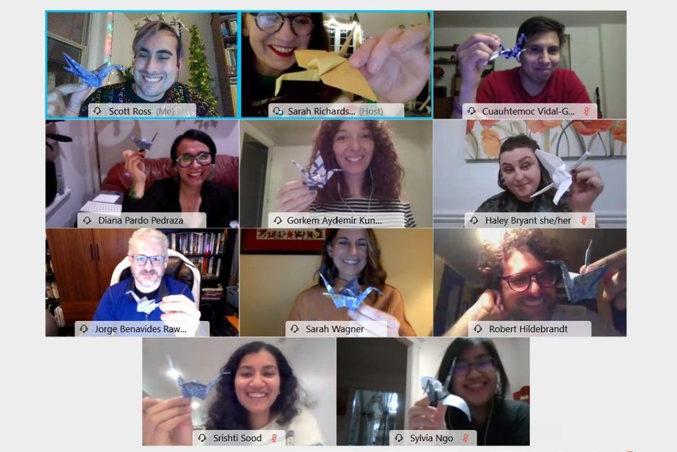 As our first semester of remote Anthropocinema came to a close, we contemplated the traditional Holiday Office Bash as an event we should reinstate, and decided it was also time to invite members to submit their own audiovisual contributions around the theme of “Comfort and Care.” To continue our experiment in weaving together the virtual and the material through film, media, and connection, we folded origami cranes together as our central party activity in a “Dance of Cranes.” Have you ever watched a dozen anthropologists try to instruct each other in the art of paper folding via webcam? It was absurd. It was also joyous and frustrating and perfect. And when we picked names at random to mail each other cranes, the friendships we nourished in that Zoom room took flight, moving along the networks of the United States Postal Service, Canada Post, and Correos de México. Some continue to fly.