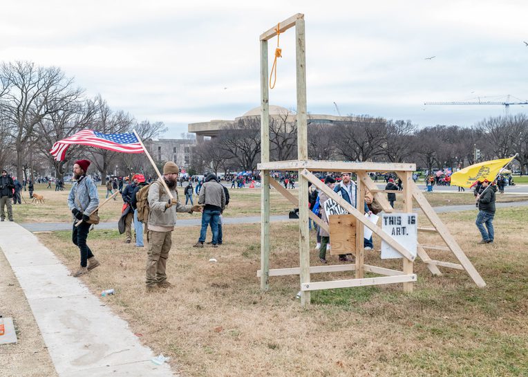 The January 6, 2021, breaching of the Capitol was preceded by the roiling festivities of the soon-to-be insurrectionary mob, a thrilling juggler’s fair with fluttering flags, caps and knitted hats (quite a few with pompoms), helmets and flak vests, masks (but not too many), hockey sticks and flagpoles, zip ties and bullhorns, baseball bats and nooses. At least one of those nooses came complete with a gallows. The noose was orange. Someone had affixed a sign to the gallows, stenciled with the words THIS IS ART, a startling image captured by the Brooklyn-based documentary photographer Radcliffe (Ruddy) Roye (2021) in a superb, unsparing photo-essay documenting Trumpist crowds from election day until inauguration day, including the day of the election certification.
