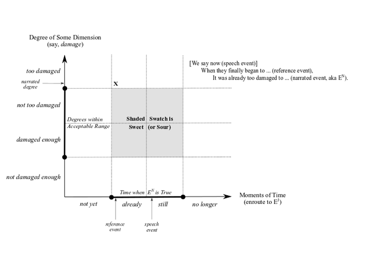The horizontal axis shows moments in time, from earlier to later. The thicker part of the horizontal axis indicates those moments of time when the judgment is being treated as true: some figure has a certain degree of some dimension (as located in relation to an acceptable range). Depending on where the reference event falls along this axis, the adverbs shown on the bottom of the horizontal axis are differentially applicable. Moreover, just as the reference event can fall within or outside of this range, the speech event can occur more or less before or after the reference event (assuming the later is actualized).