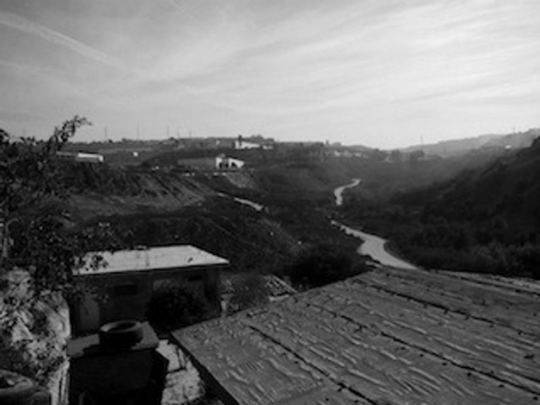 A working-class neighborhood, with a dirt road leading to the assembly-plants in the distance.