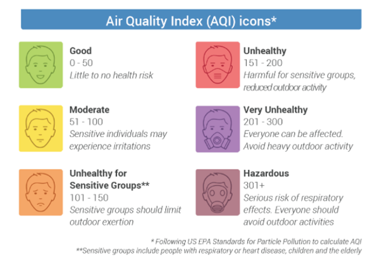 As Choy (2012, 146) notes, “the ongoing tuning, tweaking, and reiterating of numbers, graphs, and maps becomes [sic] central to affective and aesthetic work—the making visible and experienceable (or invisible and unexperienceable) of risks that are difficult to articulate.” The rise of information platforms like AirVisual in the last five years have expanded the repertoire of techniques of visualization and explication. Accompanying the US AQI reading on the AirVisual app and its basic numbers about the atmospheric conditions (temperature, probability of precipitation, wind speed, and so on) are numerous embodiments of translation. There is a description of the US AQI reading, which follows the US EPA categories, which ranges from “Good” (0–50 US AQI) to “Moderate” (51–100 US AQI) to “Unhealthy for sensitive groups” (101–150 US AQI) to “Unhealthy” (151–200 US AQI) to “Very unhealthy” (201–300 US AQI), and, finally, to “Hazardous” (301–500 US AQI). AirVisual also presents icons of faces against the standardized U.S. EPA colored categories of air pollution. There is the smiling face pressed onto a cheerful green background for “Good” while the faces representing the “Unhealthy,” “Very unhealthy,” and “Hazardous” categories wear increasingly heavy-duty protections with the Hazardous icon appearing to wear a HAZMAT-style mask (see image below). AirVisual also provides accompanying health recommendations that translate AQI readings for users/breathers into actionable steps like “wear a mask outdoors,” “run an air purifier,” “close your windows to avoid dirty outdoor air,” and “avoid outdoor exercise.” Furthermore, AirVisual breaks down the day into charts depicting hourly and daily AQI levels and provides forecasts to its users/breathers.