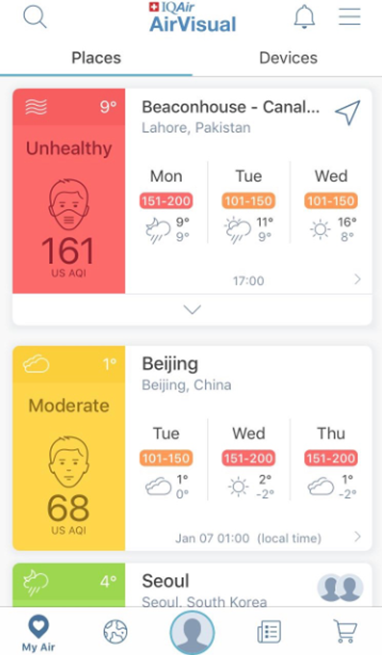 These cities do not have any specific meaning to me as a user/breather in Lahore—I do not live near them, I have not traveled to them anytime recently, nor have I searched for information about their conditions. In what way, and for whom, are these global comparisons meaningful? How does digitally and atmospherically placing the user/breather in relation to these global metropolises matter? What kind of user/breather subject does the app anticipate or create?
