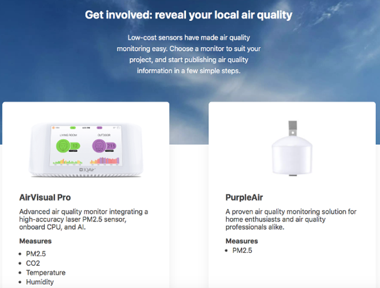 When I click the button “Become a Contributor,” I am directed to purchase the AirVisualPro or other sensors from PurpleAir—“an air quality monitoring network built on a new generation of ‘Internet of Things’ sensors”—costing between US$179 to US$259 (see image below). Now, buyers/breathers too can share their personal AirVisual Pro’s data “with the community.”