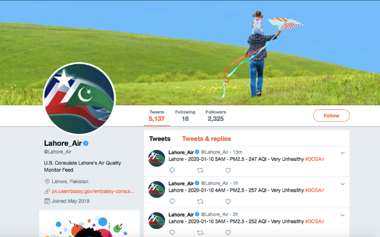 As soon as the smog rolled into Lahore at the end of last October, there was much talk among those new to Lahore’s “fifth season” (myself included) concerning how to read the air, and which sources to refer to for information. Some foreign students looked to the "NowCast Air Quality Index" maintained by U.S. diplomatic missions around the world. The U.S. embassy and consulates in Islamabad, Lahore, Peshawar, and Karachi have set up air quality monitors that measure, convert, and translate the air into knowable standards to “help inform health-related decisions.” The monitors “measure airborne fine particulate matter,” which is collected and “translated into actionable information by the US Environmental Protection Agency’s (EPA) NowCast algorithm.” It converts the dangerous airborne fine particulate matter (which is “commonly referred to as PM 2.5 because the particulates are less than or equal to 2.5 microns in diameter”)—a “standard recognized by the EPA”—into an Air Quality Index (AQI) value. Since spring 2019, U.S. consulates and embassies around Pakistan post hourly AQI readings on their dedicated twitter feeds. As seen below, at @Lahore_Air, @Islamabad_Air, @Karachi_Air, and @Peshawar_Air, AQI’s unfurl from a pixelated image of a parent and child flying a kite against hyperbolic blue skies.