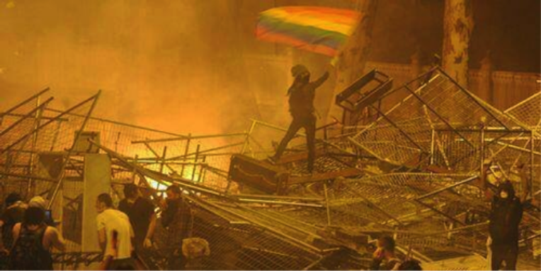 Near sunrise on May 31, 2013, the Istanbul police forcefully entered Gezi park, shattering and burning the tents and belongings of a few protestors who had occupied the park to stop it from being turned into a replica of an Ottoman garrison. The next day, thousands arrived at Gezi with indignation, initiating the process of Gezi’s emergence as a counter-public at both the national and international levels. It had gradually become a space for uncommon encounters between indefinite strangers, bodies, experiences, and discourses. Within this newly opened political space, queers of Istanbul became a major protest group, making the rainbow flag one of the most visible symbols of the movement.