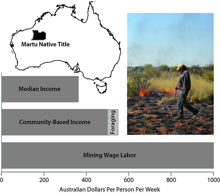 Moreover, giving up being Martu has consequences far beyond the individual and his or her identity. Maintaining a customary component of Martu economies feeds back to provide important benefits to the public at large (Moritz, Ens, and Altman 2015). In order to hunt, Martu burn their country in a way that increases biodiversity (Bliege Bird et al. 2008), buffers the region from the effects of climate-driven wildfires (Bliege Bird et al. 2012), and maintains habitat for endemic fauna (Codding et al. 2014). Such ecosystem services save the public far more than the government currently invests in remote Aboriginal communities (Bliege Bird et al., forthcoming; Codding, Bird, and Bird 2015).