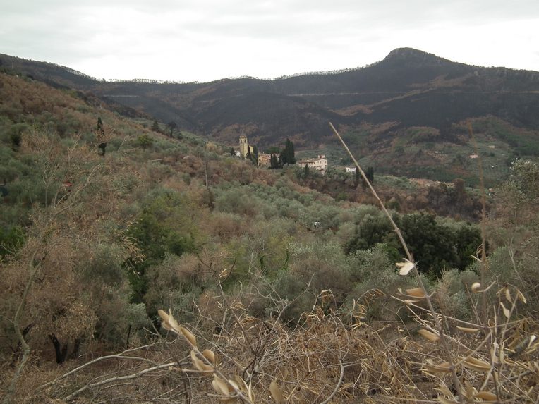 Recent disastrous fires have made people in this region intensely aware of the effects of landscape abandonment. In the fall of 2018 a wildfire burned 1,400 hectares of forests and olive terraces, destroying seven homes, and threatening a historic monastery. In the wake of this disaster, an effervescence of political and social action inspired volunteers to repair burned slopes and stabilize river beds, with the aim of preventing landslides. A new organization, the Comunità del Bosco was founded in 2018, with the goal of reintroducing landscape care that could partially address legacies of agricultural abandonment. A range of projects have ensued, from creating firebreaks around homes, to thinning forests and replacing fire prone pines with other species. Although controlled burning experiments on the crest of the mountains show promise, prescribed burning remains an almost unknown concept. The legacy of state fire suppression has created intense stigma around fire use, and traditions of prescribed burning in fields (to reduce stubble) and in mountain pastures (to produce grass for sheep and goats) have little contemporary echo. Nevertheless, the positive effects of grazing are remembered. Some homeowners are bringing back sheep to graze on their olive terraces, with the goal of reducing fire risk.