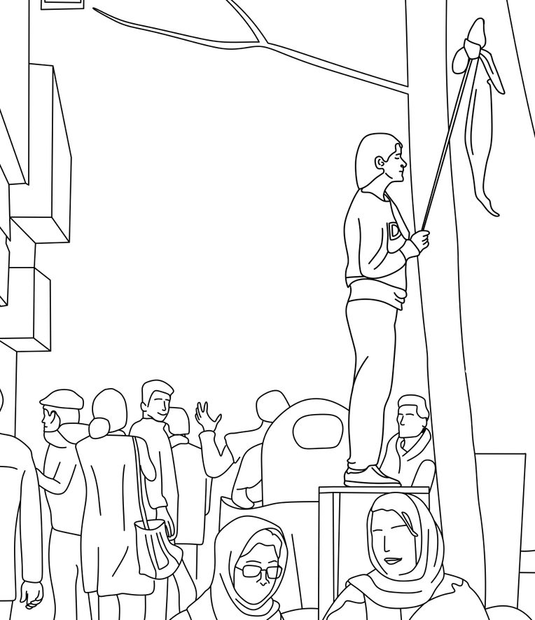 In the Woman, Life, Freedom uprising, women have largely appeared anonymously. Anonymity is not just for protection, which it does not guarantee anyway. Many women remove their identities from the story their creative acts of protest to amplify the political message of their work. In commemoration of the 2015 terrorist attack on their Paris offices, Charlie Hebdo published cartoons of Iran’s supreme leader, Ayatollah Ali Khamenei, on January 4, 2023. For Charlie Hebdo, whose depiction of Islam and Muslims often risks exacerbating racial and civilizational tropes of European society, this was an act of solidarity with Iranian protesters who were being charged with “enmity against God and the Islamic state.” Following the publication, the Iranian regime issued a warning about the “indecent and insulting” nature of the cartoons. On January 8th, a prominent commercial billboard above Tehran’s bustling Hemmat Expressway exhibited a Charlie Hebdo-inspired parody. The image depicted Khamenei wearing a turban fashioned from nooses, accompanied by the caption, “Water the tree of the revolution with my blood.” The installation process was captured on video and shared widely on social media, featuring a masked young woman perched atop the unsteady metal pole from which the banner was suspended. The footage showed her striking a pose with arms raised and flashing the “V” sign for victory.[2]